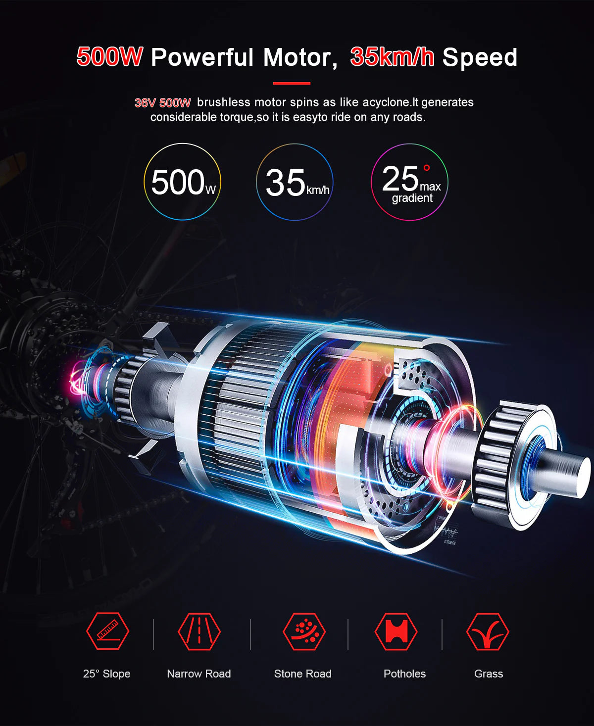 The motor’s impressive torque allows for smooth and effortless rides on various terrains, including narrow roads, stone paths, potholes, and grass.